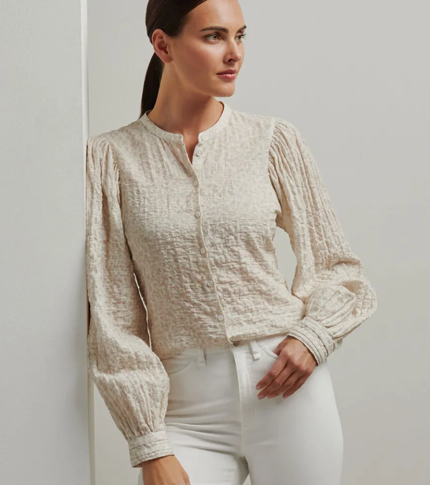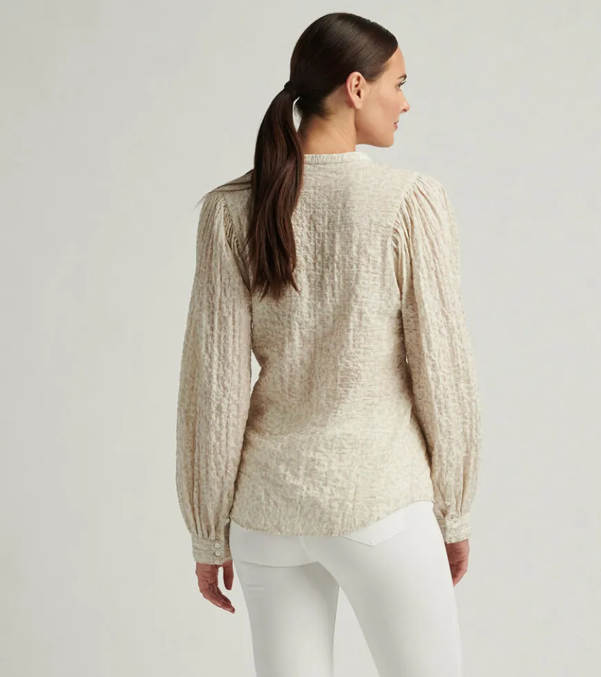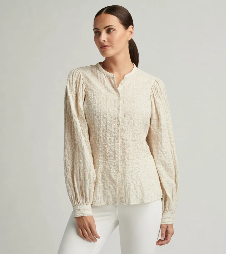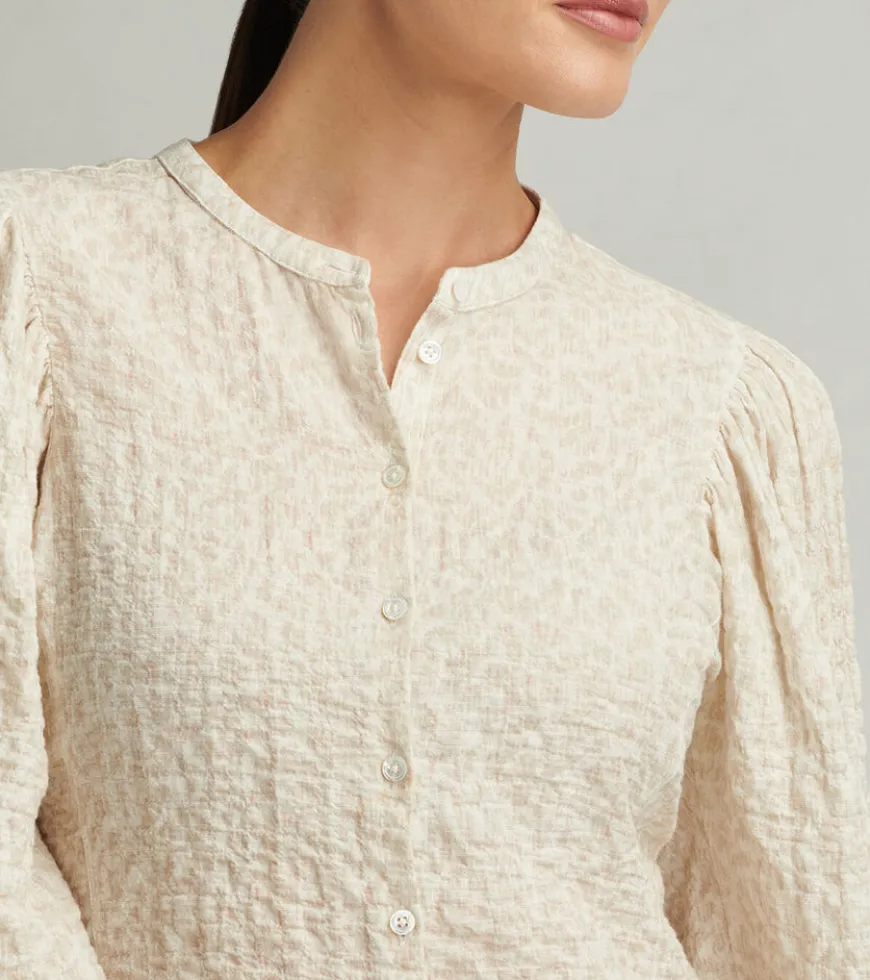 This charming cotton blouse marries a custom abstract animal print with a seasonal seersucker fabric. It’s thoughtfully shaped with voluminous sleeves, inset slightly to allow them to drape nicely on the shoulder, and princess seams that taper toward the body. Finished with a low-profile collar, a French placket and high pleated cuffs.