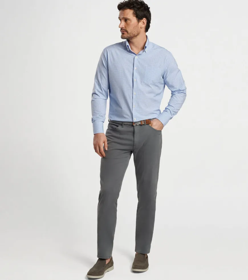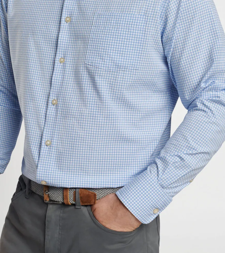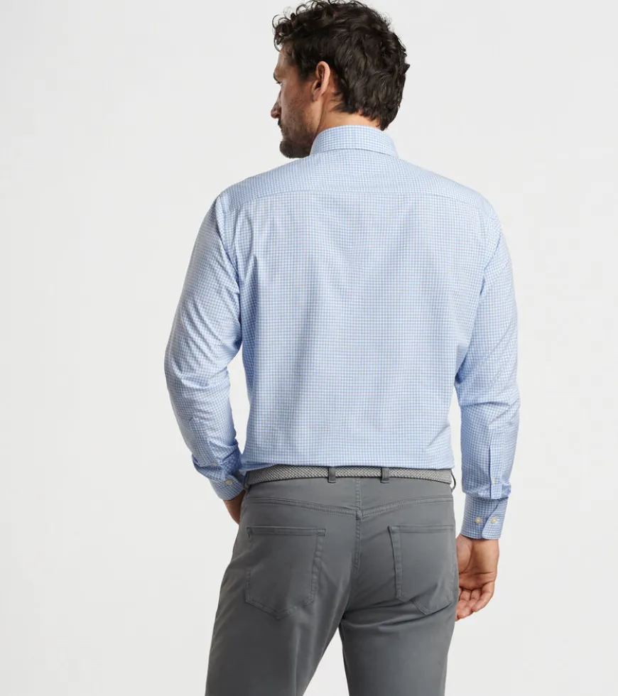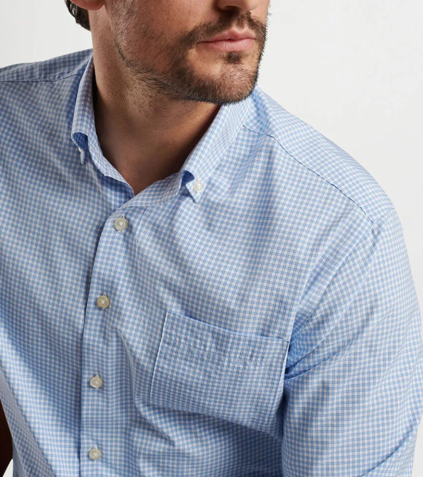 This sophisticated essential conveys the classic look of a poplin shirt in an easy-care performance fabric that offers two-way stretch, wicking and UPF 50+ sun protection. Finished with a button-down collar, French placket and double-button barrel cuffs.