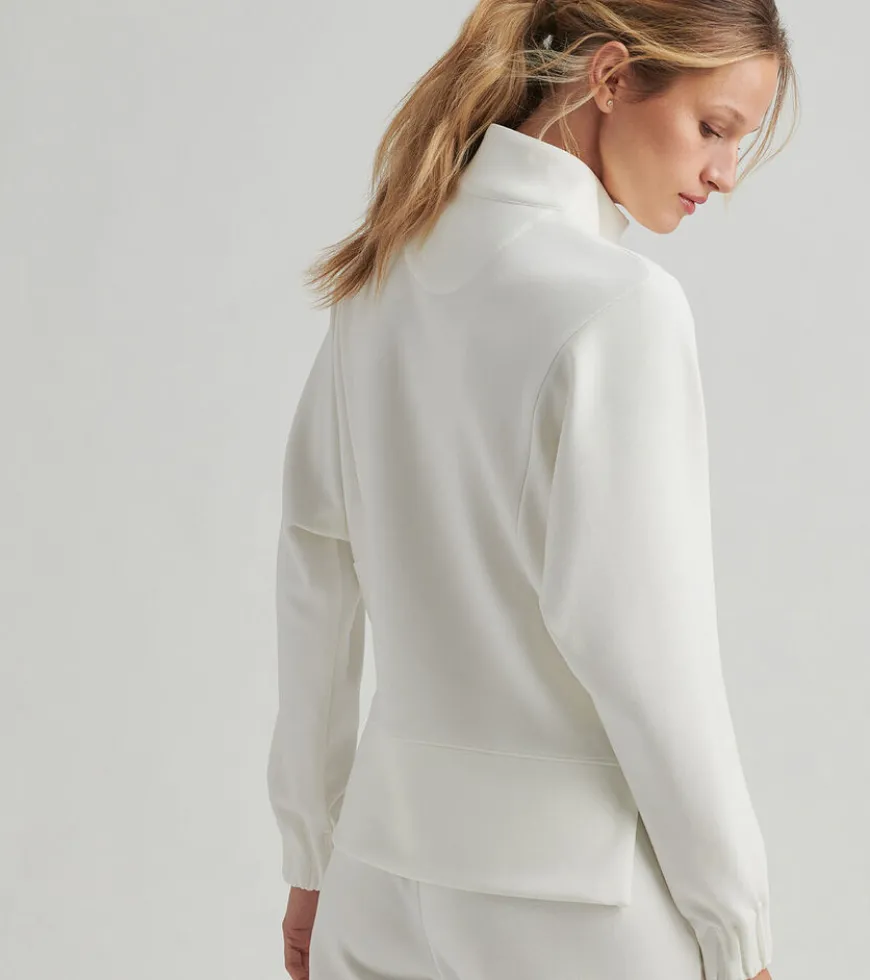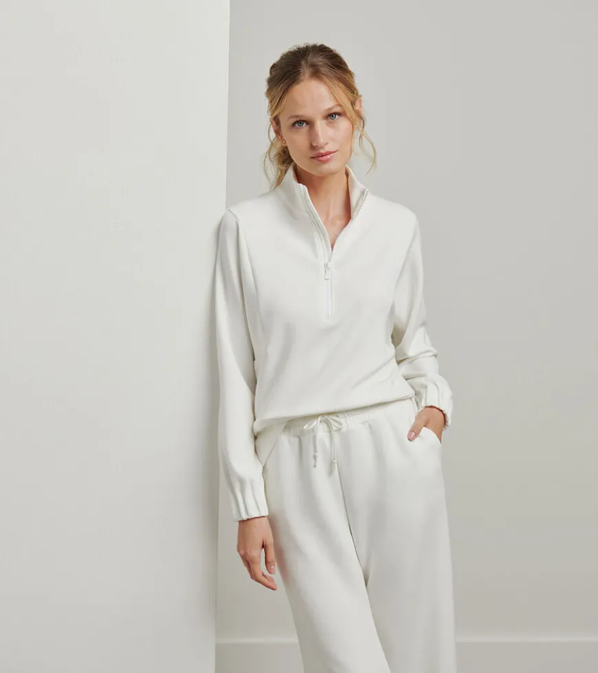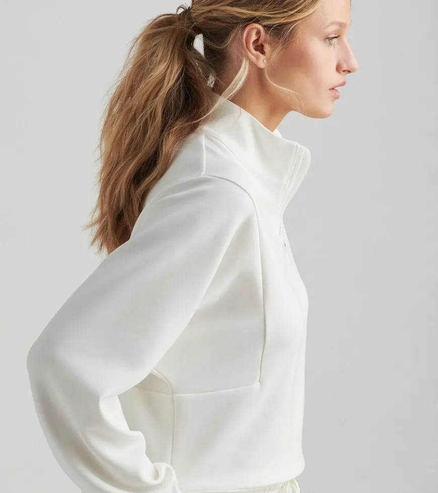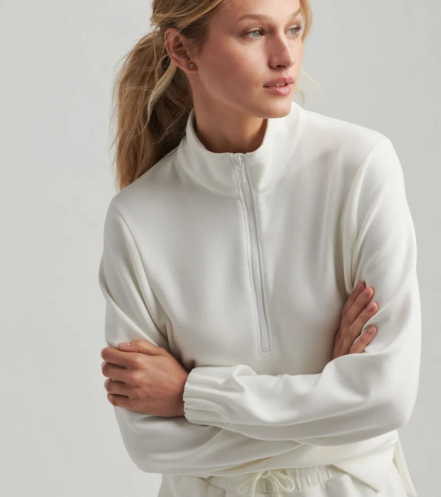 An easygoing layer you’ll want to live in every day, this pullover is made from a sublimely soft stretch jersey fabric with a plush midweight feel. Dolman sleeves that angle toward the waist shape a flattering fit, while pintuck gathers at the cuff create a clean finishing detail. Finished with a half-zip opening, it’s the perfect grab-and-go piece.