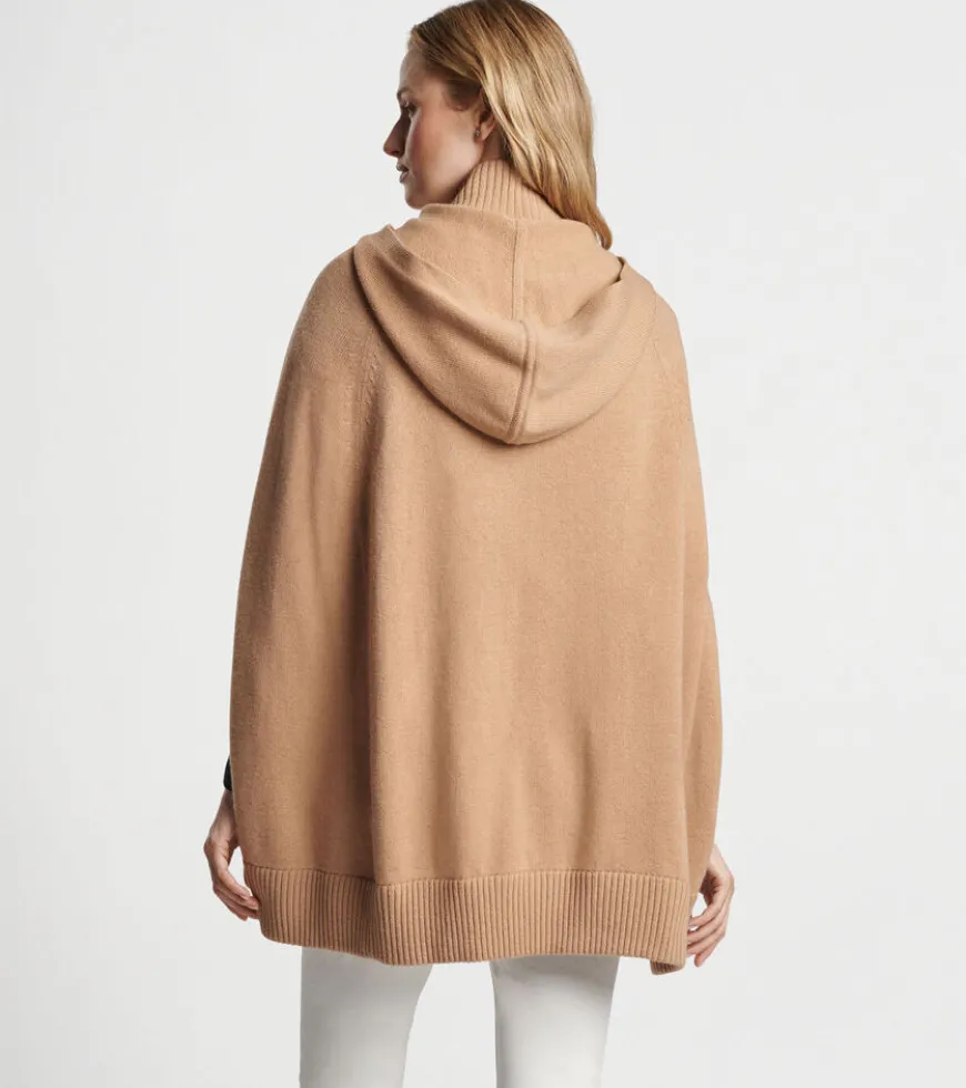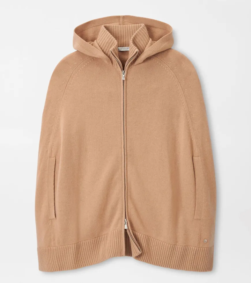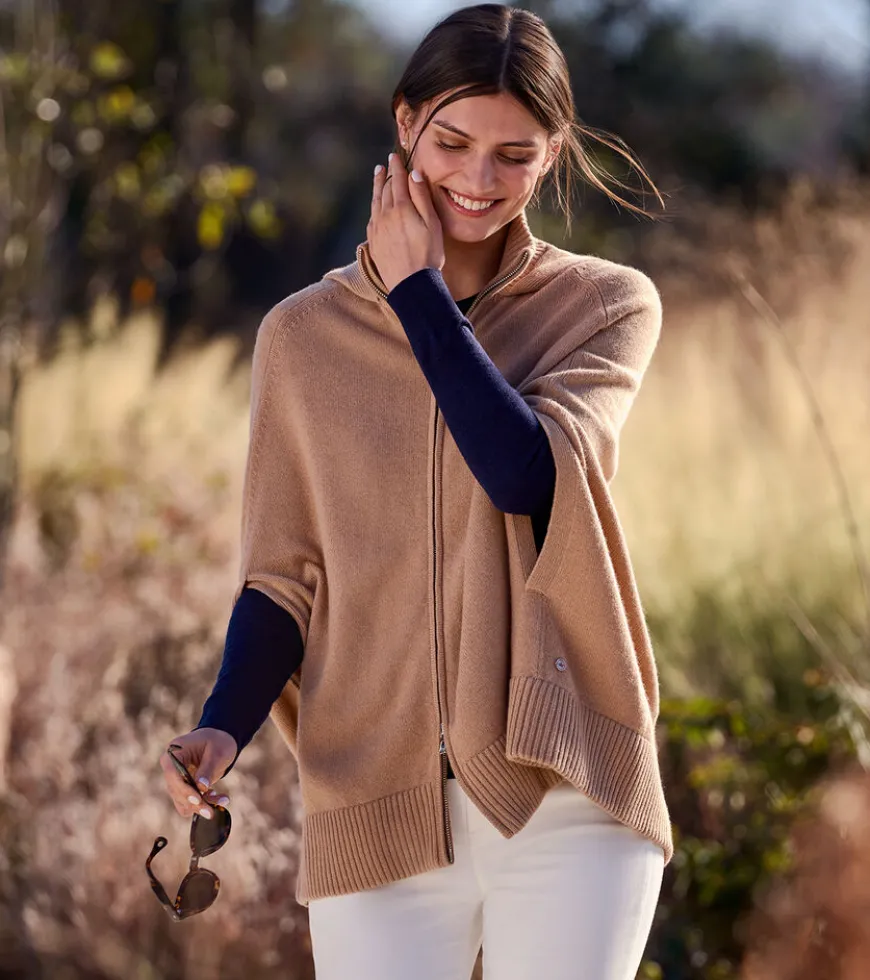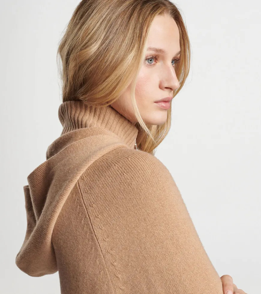 A versatile statement piece that’s as cozy and comfortable as it is elegant. Shaped by a 7-gauge Merino and cashmere knit, this luxurious layer zips in the front and drapes beautifully across the shoulders. Detailed with a low-profile hood, rib knit collar and hem and a subtle mother-of-pearl brand.
