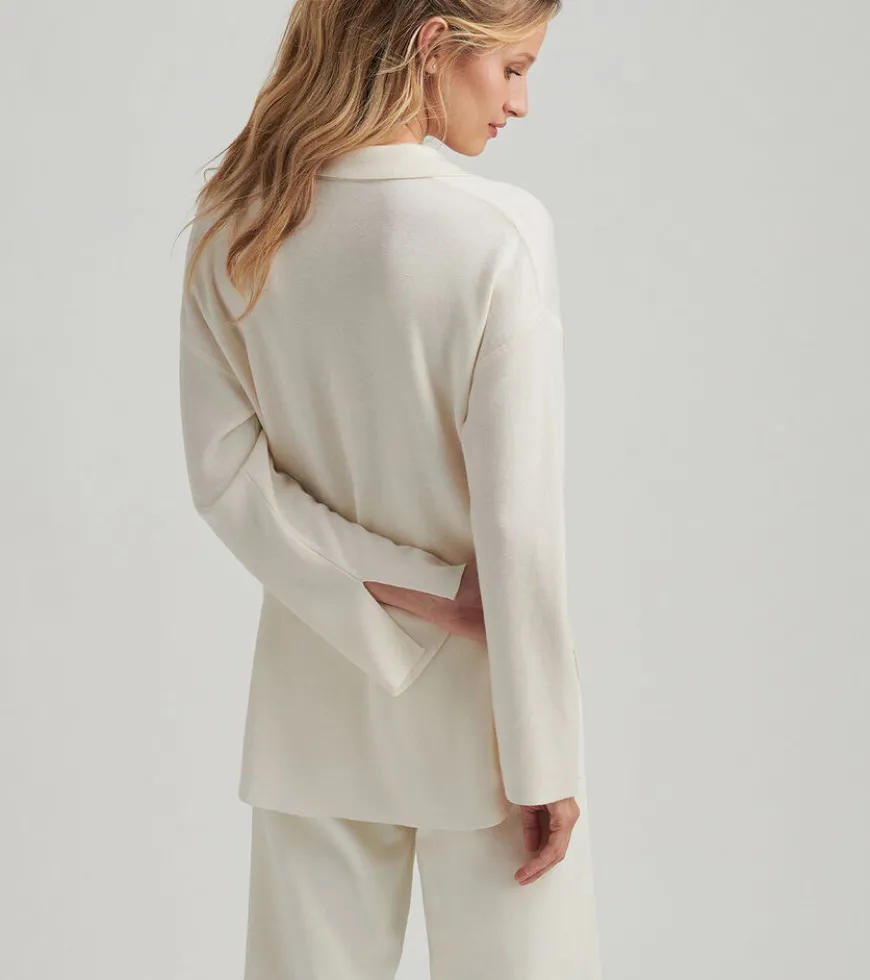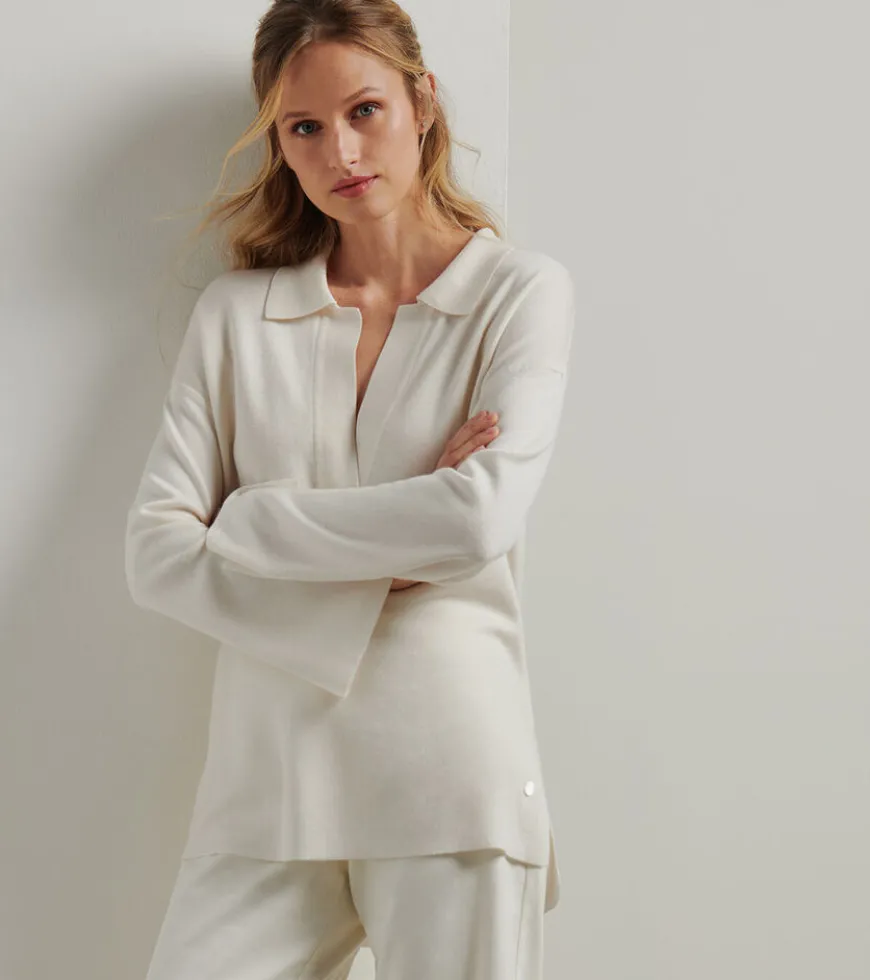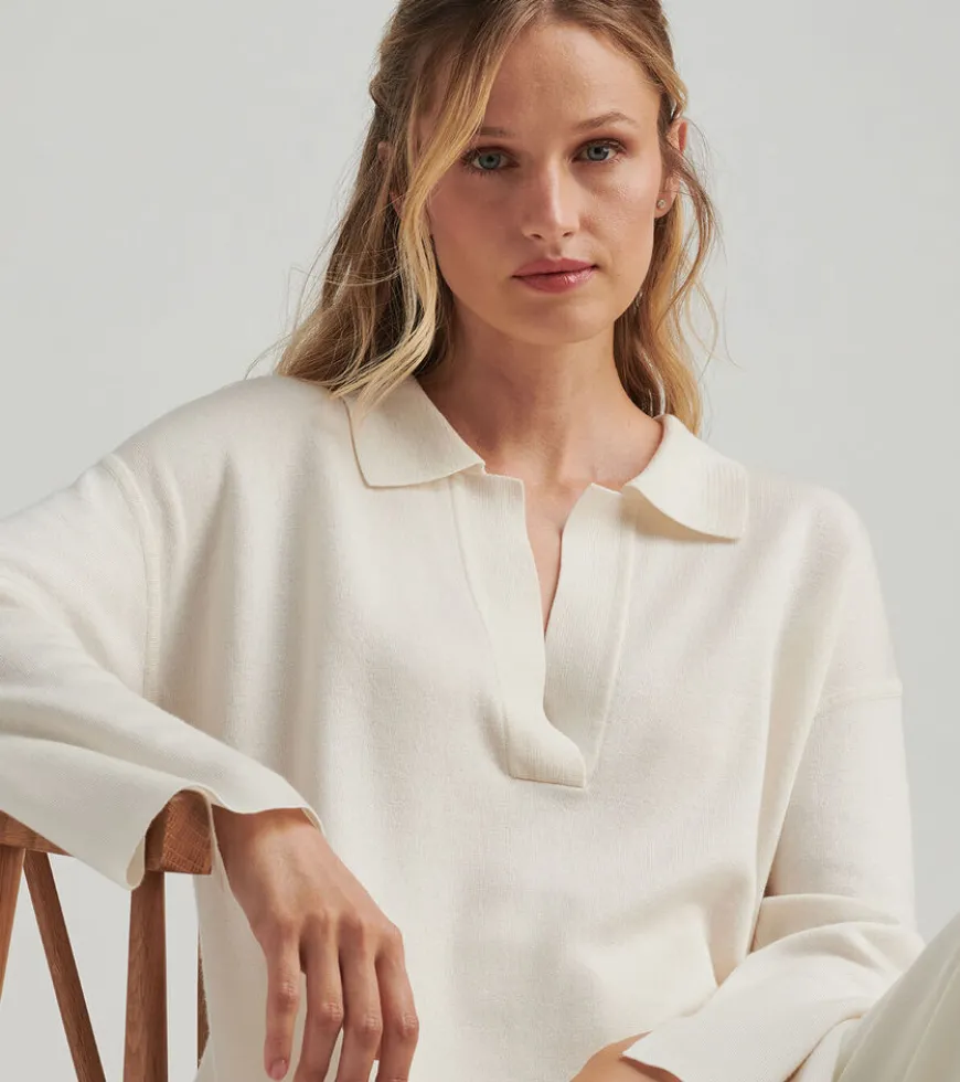 An elegant popover that shines in softness and detail. The lyocell-cashmere yarn is knit an interlock stitch and feels smooth and cool on the skin. A beautiful pointed spread collar is angled downward for a stylish expression and a full-needle placket gracefully frames the V-neck. Tubular seaming furthers a clean, flowing aesthetic and vented sleeves fall just past the wrist.