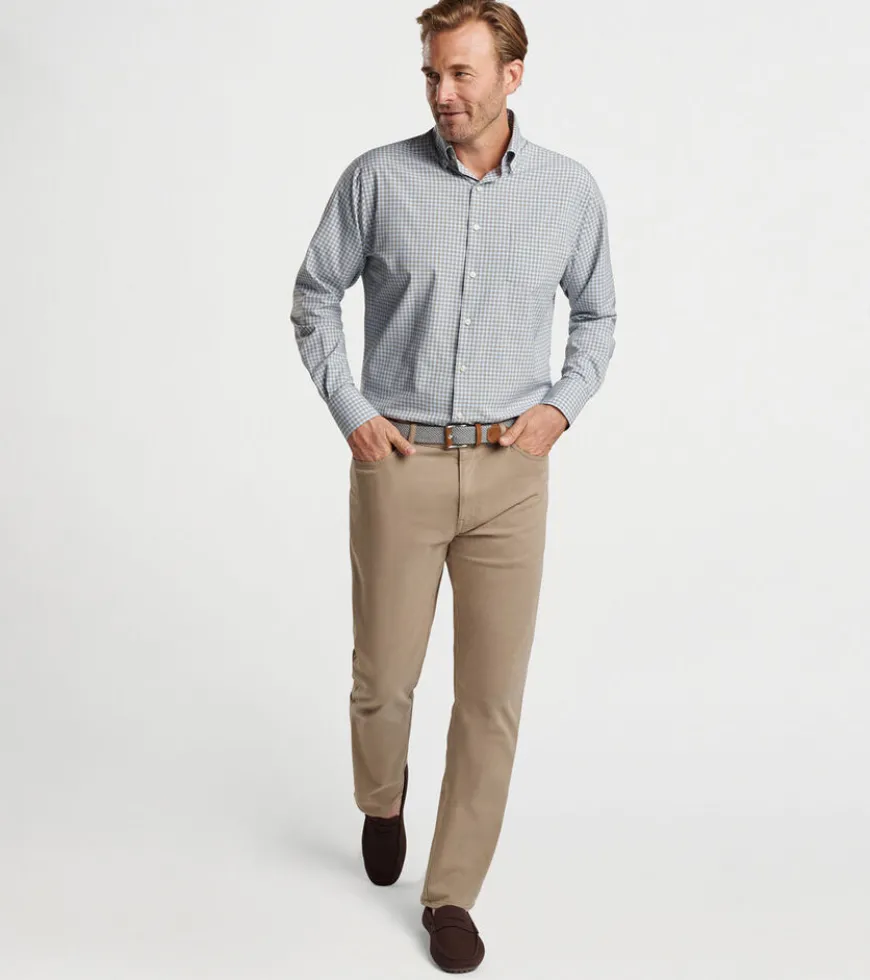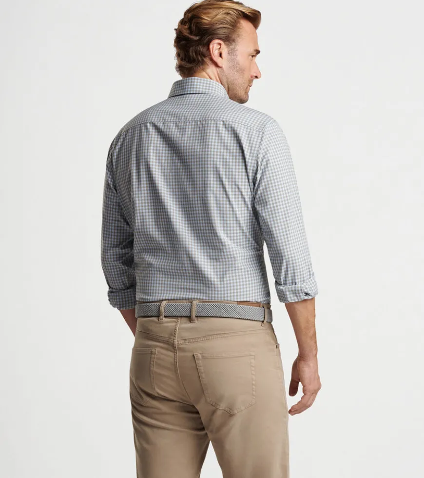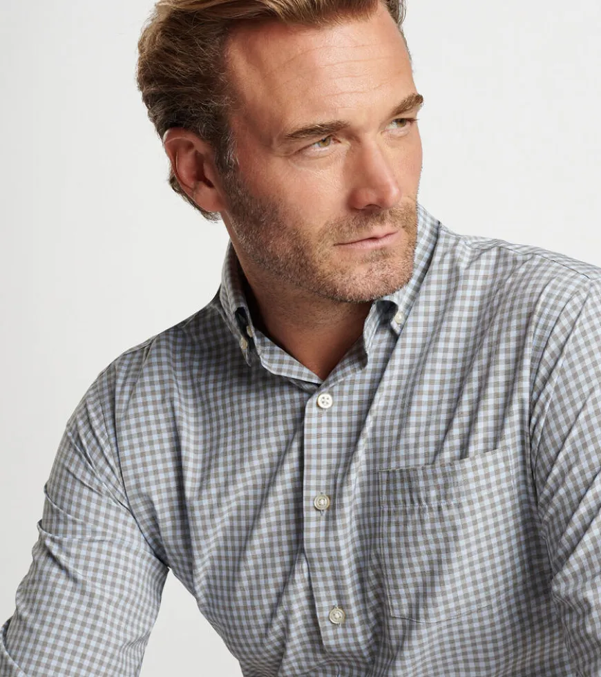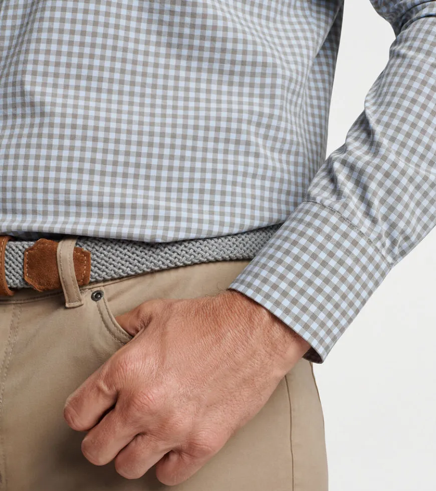 This sophisticated essential conveys the classic look of a poplin shirt in an easy-care performance fabric that offers two-way stretch, wicking and UPF 50+ sun protection. Finished with a button-down collar, French placket and double-button barrel cuffs.