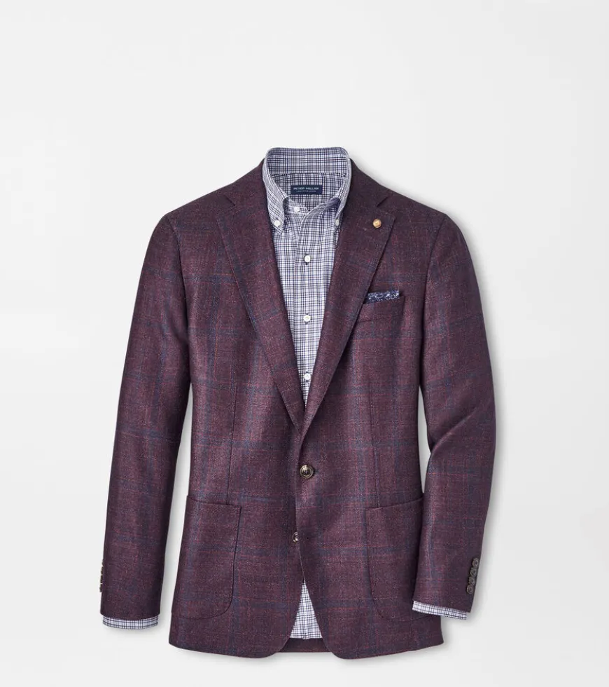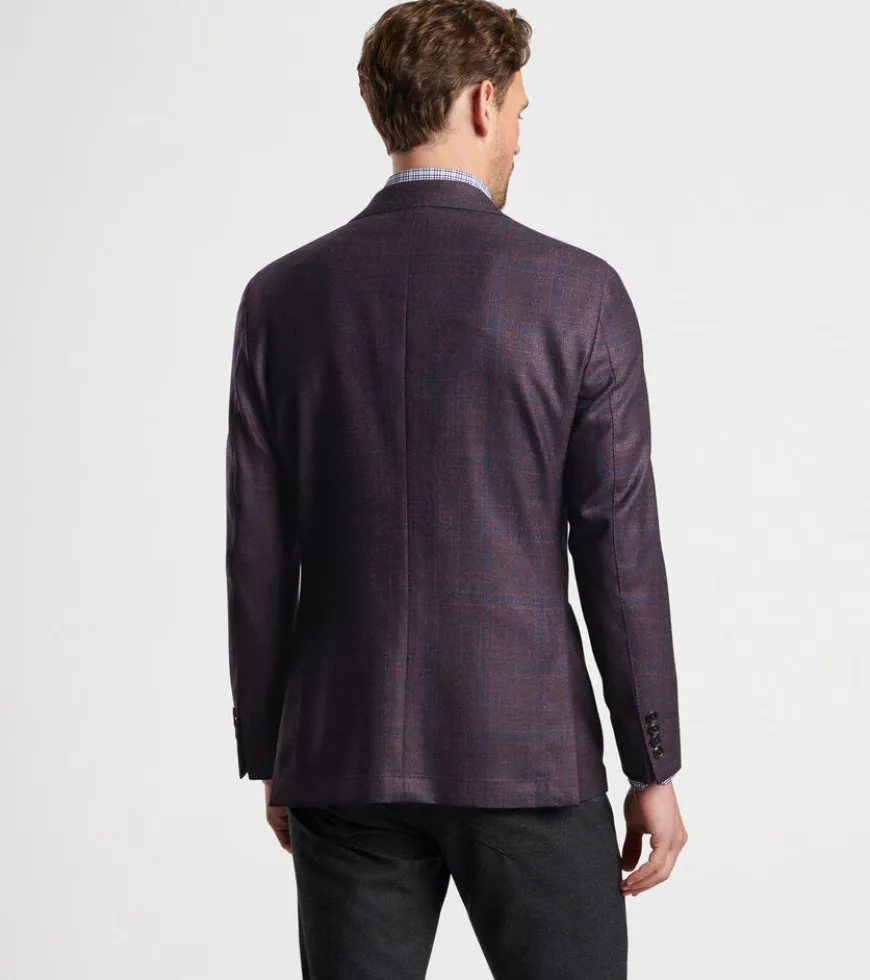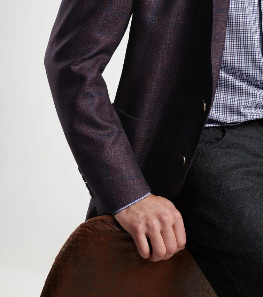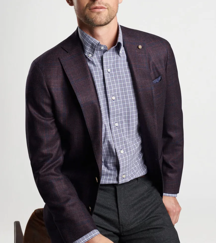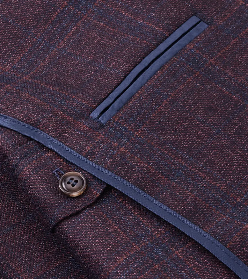 Crafted from a luxurious blend of wool, silk and cashmere from Italy, this elegant soft jacket showcases a rich burgundy with a subtle plaid pattern. It’s cut with a with a natural shoulder and constructed with a half-lined interior for relaxed wear. Detailed with a notched lapel, barchetta chest pocket and teardrop buttonholes, and finished with a hand-tacked lapel pin and genuine Italian horn buttons.
