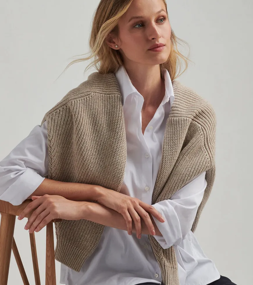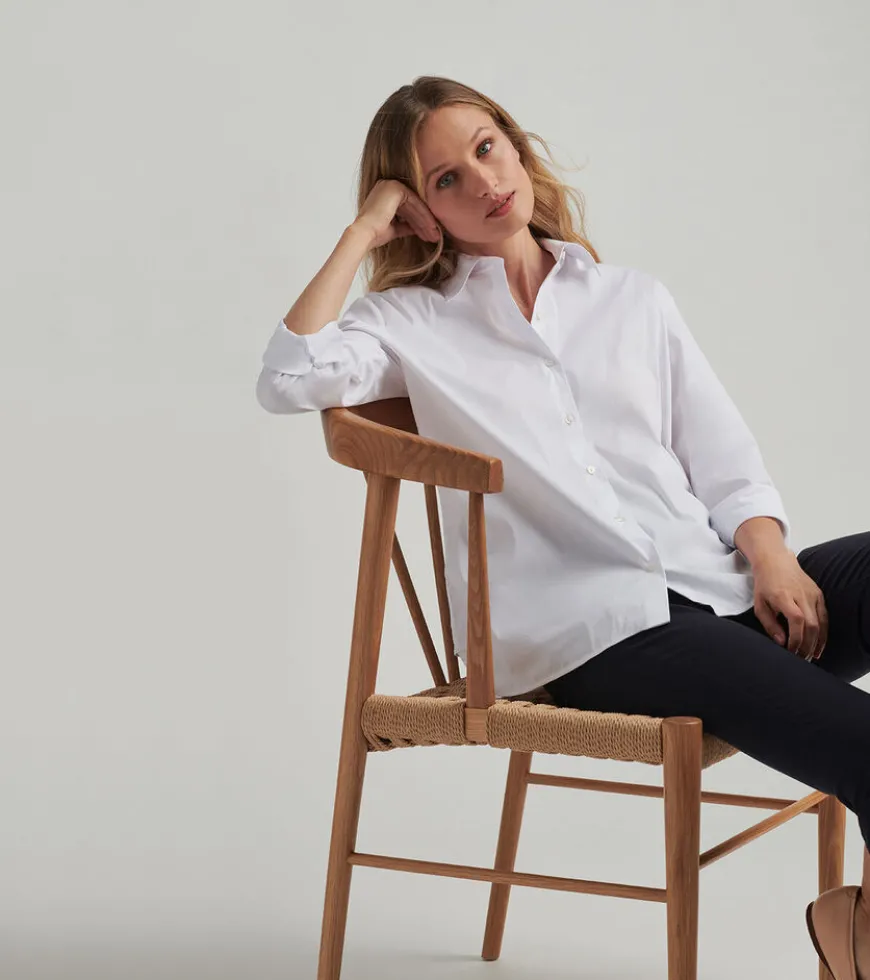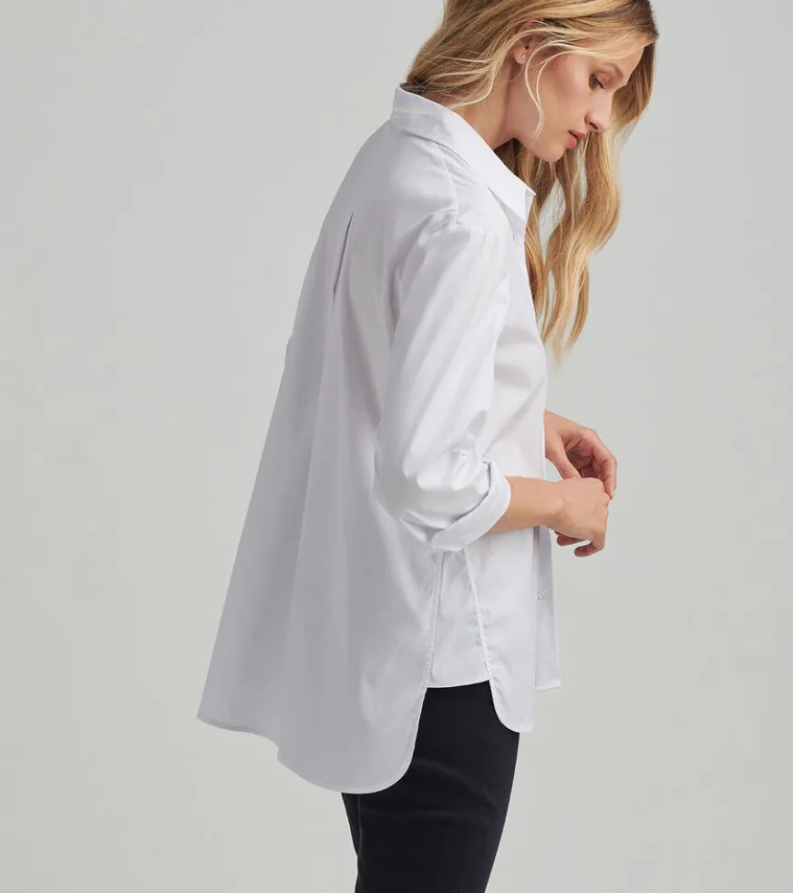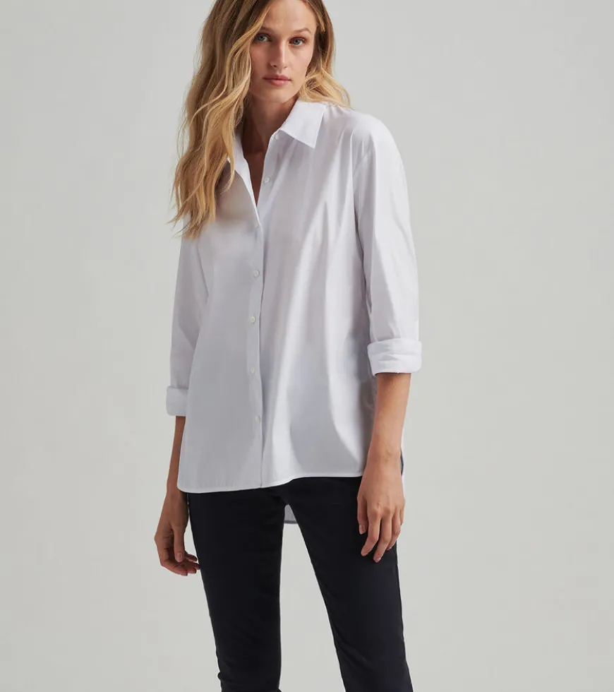 Our take on the essential white button-up, perfected in the details. It’s crafted from a crisp stretch poplin with a hint of nylon for a cool feel on the skin, with a relaxed shoulder and an oversized fit. Detailed with a feminine pointed collar, mother-of-pearl buttons and tuxedo hemline, and finished with a drop tail.