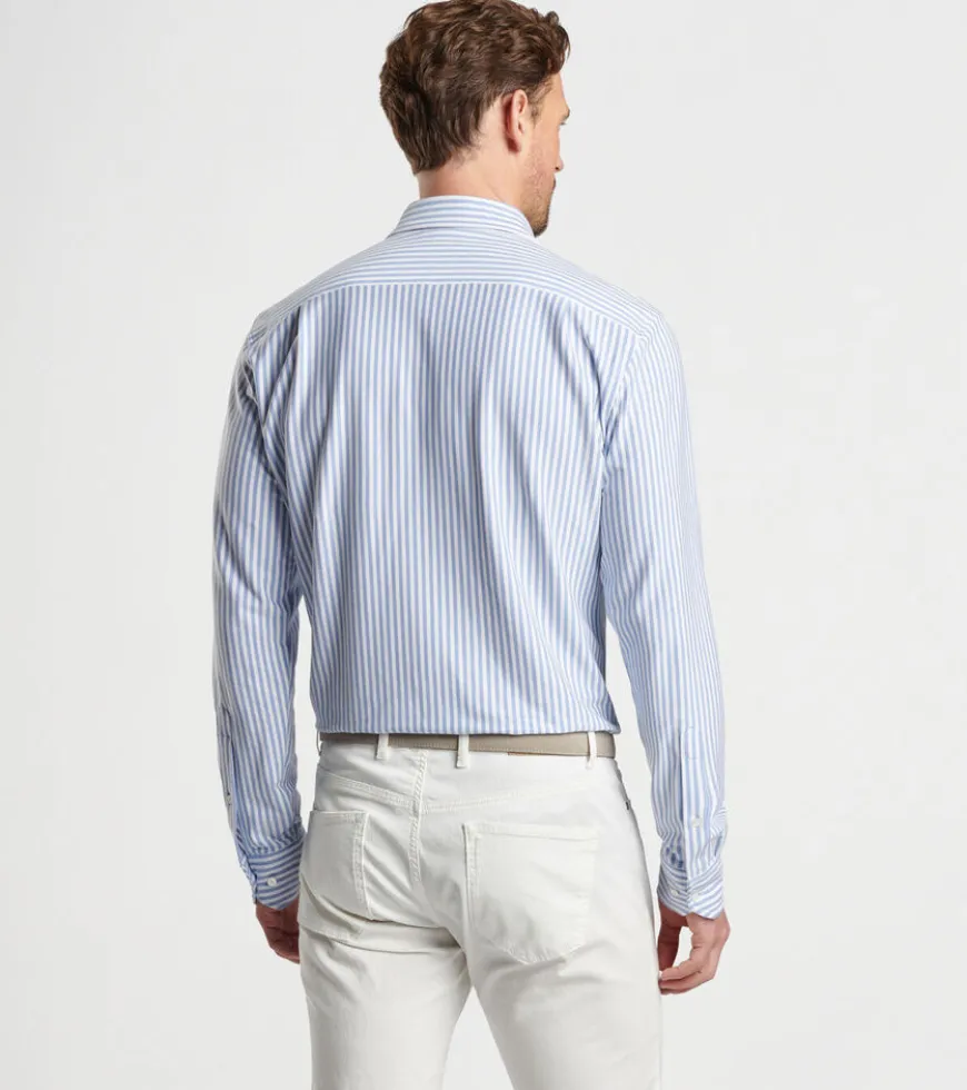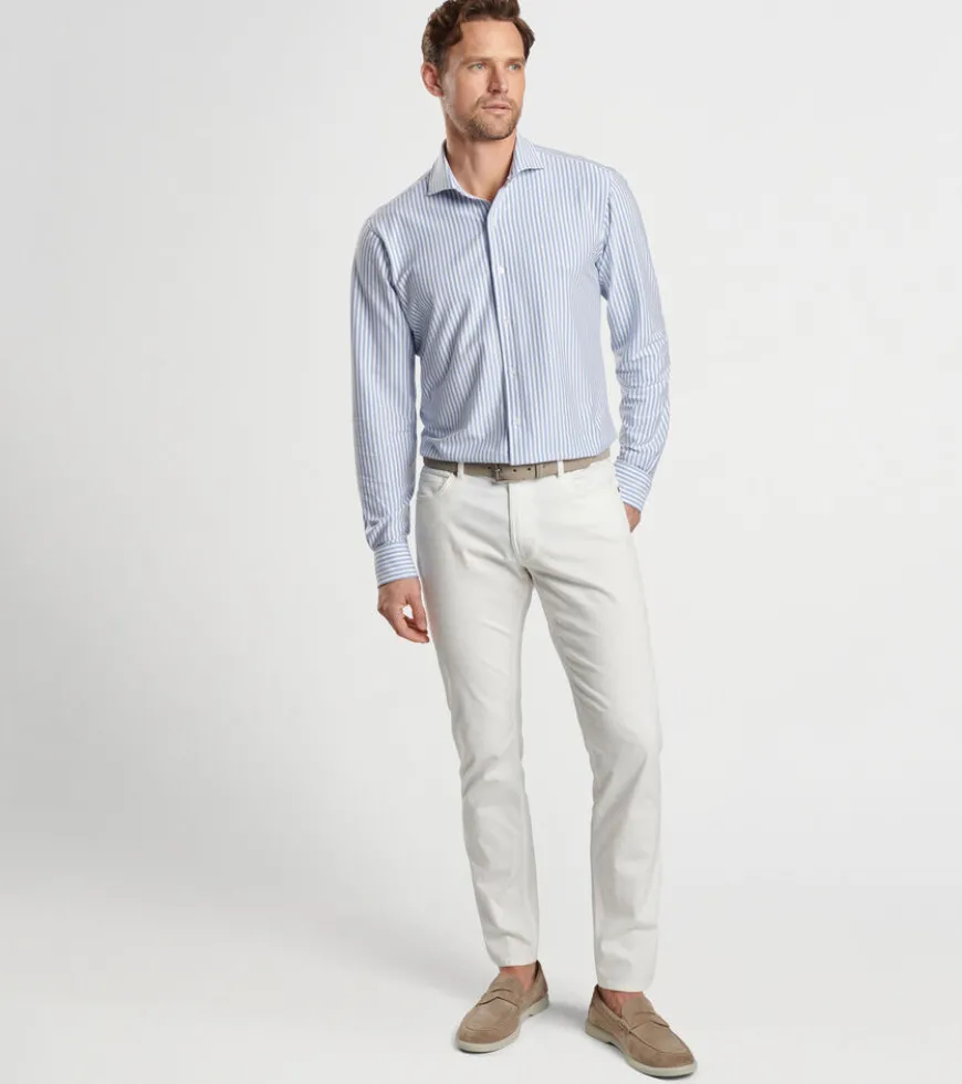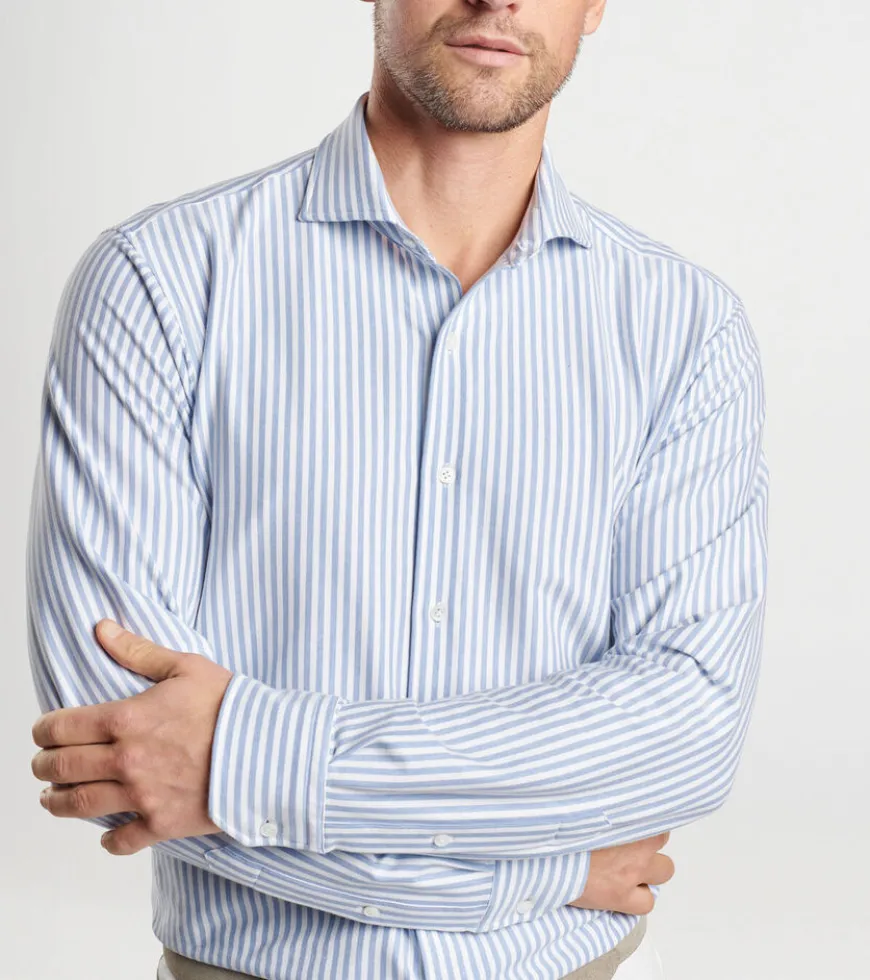 This sport shirt is shaped by an exceptionally soft, extremely flexible fabric from one of Italy’s finest mills that offers classic looks alongside modern functionality. A clean, crisp design wears like your favorite polo and dresses up or down with ease. Finished with a cutaway collar, French placket, mitered cuffs and mother-of-pearl buttons.