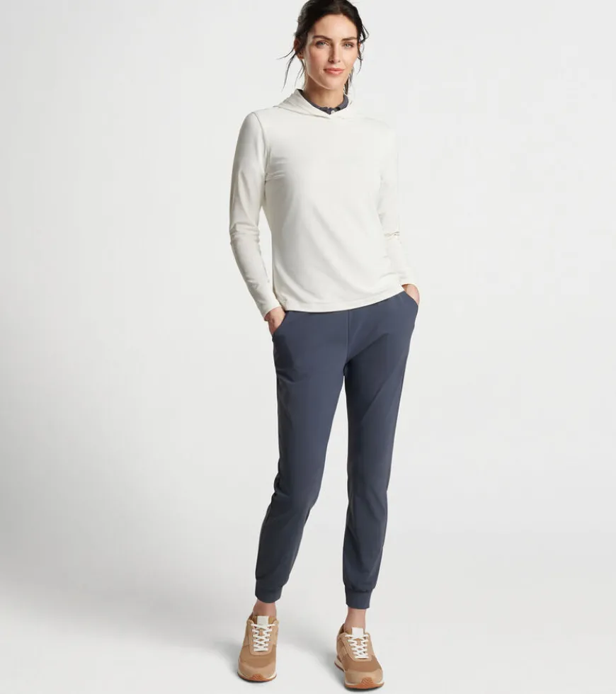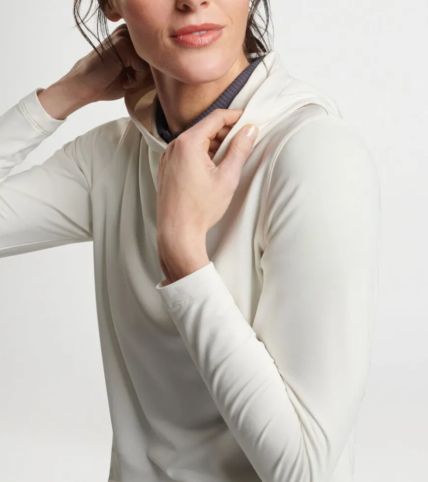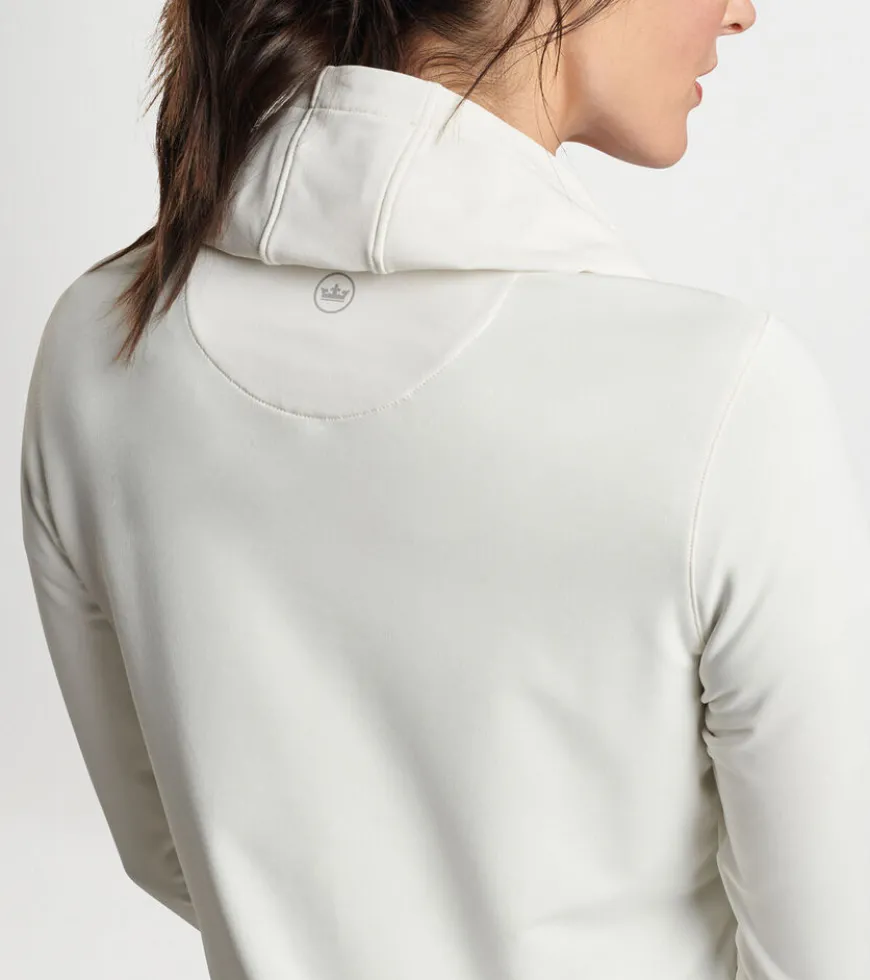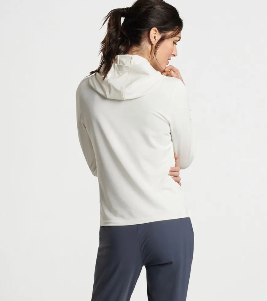 A casual silhouette with a streamlined design, this hoodie is shaped by a wicking stretch fabric with a smooth jersey exterior and lightly brushed terry back. Finished with a crossover hood and notched hem.