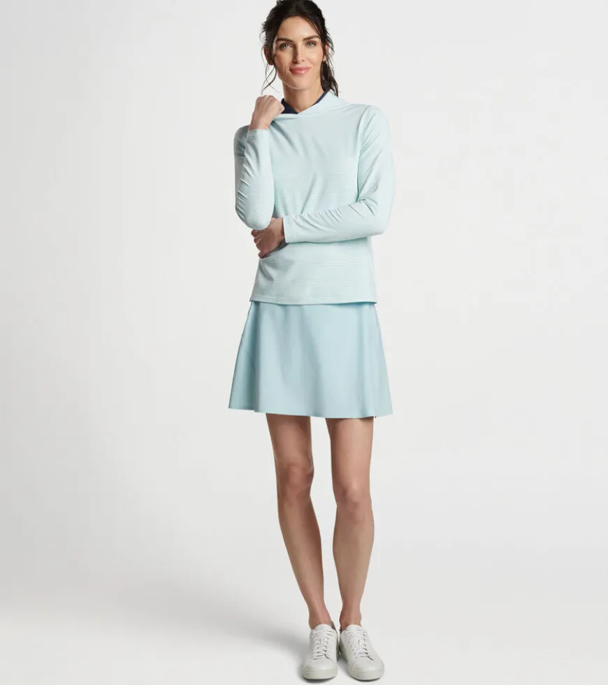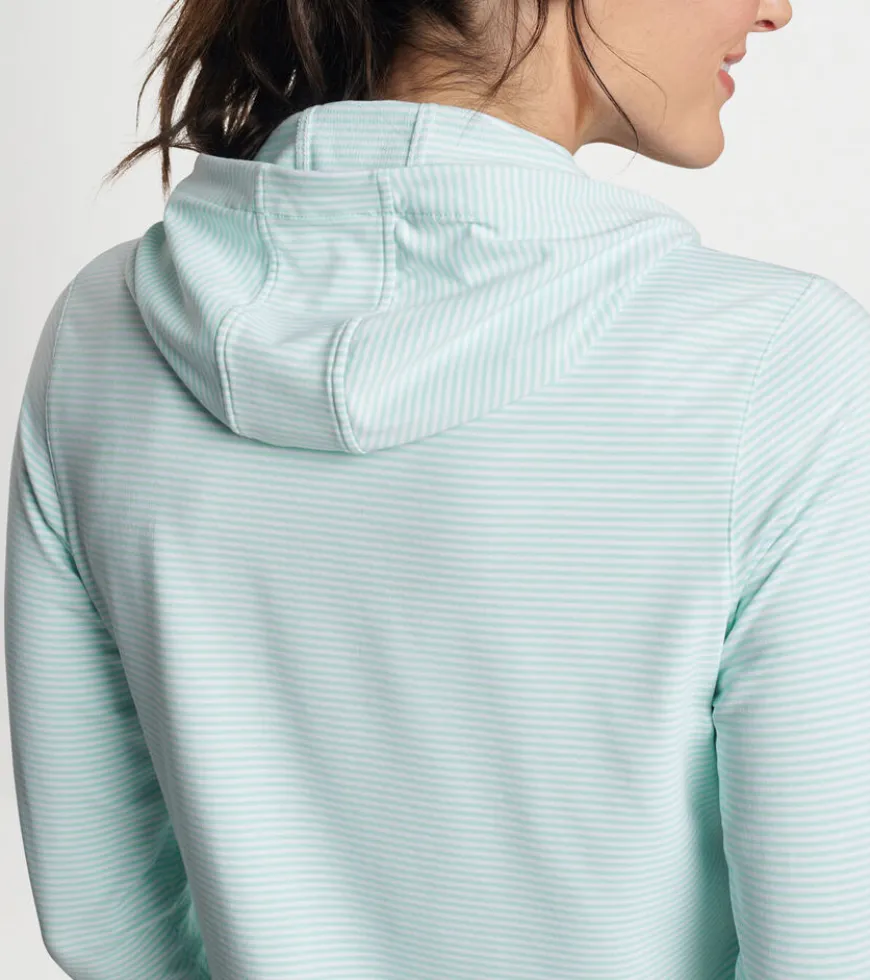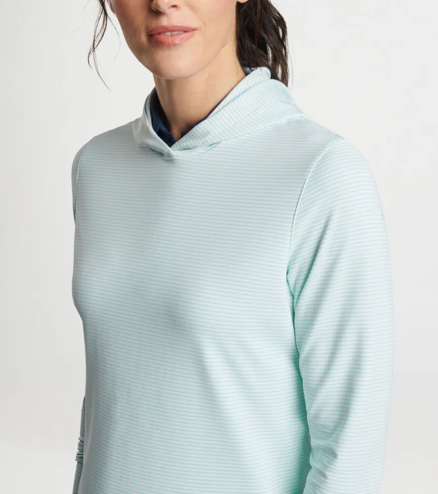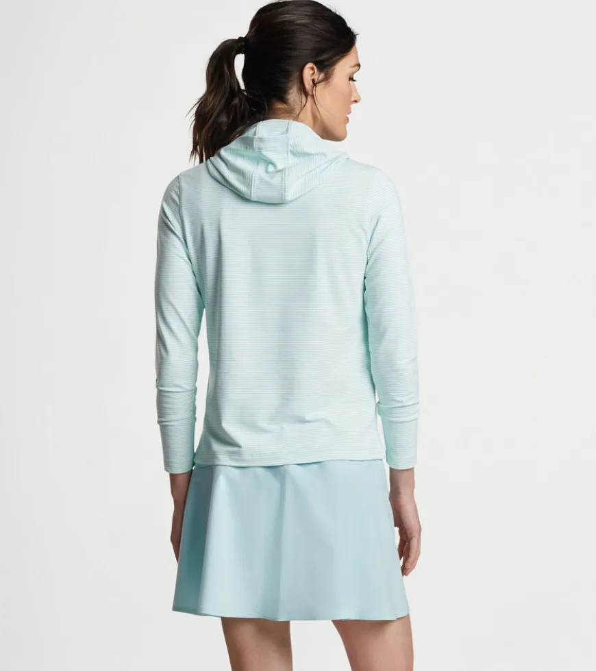 A casual silhouette with a streamlined design, this striped hoodie is shaped by a wicking stretch fabric with a smooth jersey exterior and lightly brushed terry back. Finished with a crossover hood and notched hem.